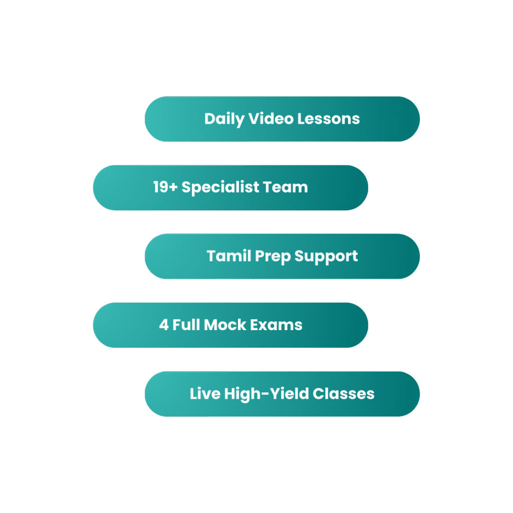 5–6 hours of Tamil-only classes with strategy, high-yield topics, and previous-year patterns.